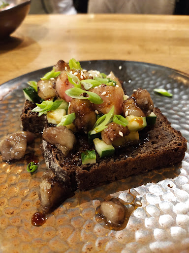 Небольшой ресторанчик. Есть как уютные небольшие столики, так и столы для компаний побольше. Но также есть столики в середине зала. Поэтому если планировать как-то мероприятие, требующее уединения, то лучше при бронировании этот момент учесть. Кухня очень вкусная. Меню небольшое, что очень хорошо, т.к. сокращаются муки выбора. Подача не сильно замороченная, но красивая. Закуска из вяленой свёклы очень прикольная🔥 Как-то её здесь вялят хитро, не разу такой не ела. Костный мозг на хлебе очень даже ничего, хотя название отпугивающее👍😁 Тар-тар из говядины тоже классный👍 Стейк и утка хорошо приготовлены. Брали среднюю прожарку, получилось всё как нужно 👍 Десерт из бородинского хлеба с морской водой нужно переименовать 😁 без расшифровки официанта он бы у меня аппетита точно не вызвал. Но попробовать его точно стоит🔥 Фондан с пармезаном хорошо приготовлен, внутри там всё как полагается достойному фондану😁👍 Обслуживание приятное. Не навязчивое, всегда рядом есть кто-то из персонала. Цены средние. На алкоголь в том числе. В итоге, ушли в отличном настроении с желанием зайти сюда ещё как-нибудь на завтрак и обед🤗 Так вот... Завтрак🔥 Порции очень большие. Наесться можно одним блюдом. Кофе достойный. Пшенная каша🤤 на молоке, с сухофруктами и кедровыми орешками Бриошь с бужениной большой и сытный. Но сам хлеб мне не очень зашёл, хочется чего-то более упругого :) Омлет и глазунья как надо👍 Итак обед... :) на обед можно и шаурму слопать😁 шаурма с говядиной🔥 можно брать :) утку готовят классно. Получается мягкая и нежная. Можно брать без опасения разочароваться 👍