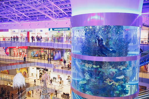 The main feature of the shopping center is the huge aquarium, which is also the first tallest in the world: 23 meters high and 6 meters in diameter, about 2,500 fish swim in it.