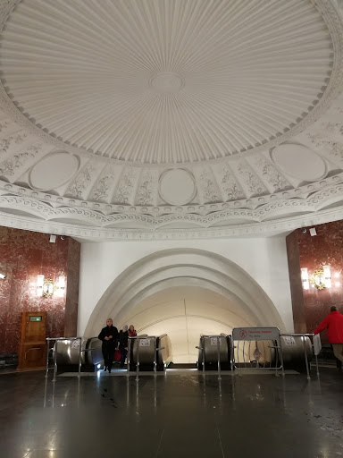 In 1952 the first turnstile in the Moscow Metro system was installed at this station.[1]. Architects Ivan Fomin and N. Andrikanis designed the station.[1] It was one of Moscow's first four deep-level stations, and one of the first two to employ a three-arched design with three parallel, circular tunnels. In this type of station, the outer tubes (which house the tracks and platforms) are separated from the larger central hall by heavy pylons. This design was planned to be used for the first time on the four central-city stations on the first Metro line, Krasnye Vorota, Chistye Prudy, Lubyanka, and Okhotnyi Ryad. However, due to construction difficulties a simpler two-arched design was implemented at Lubyanka and Chistye Prudy.