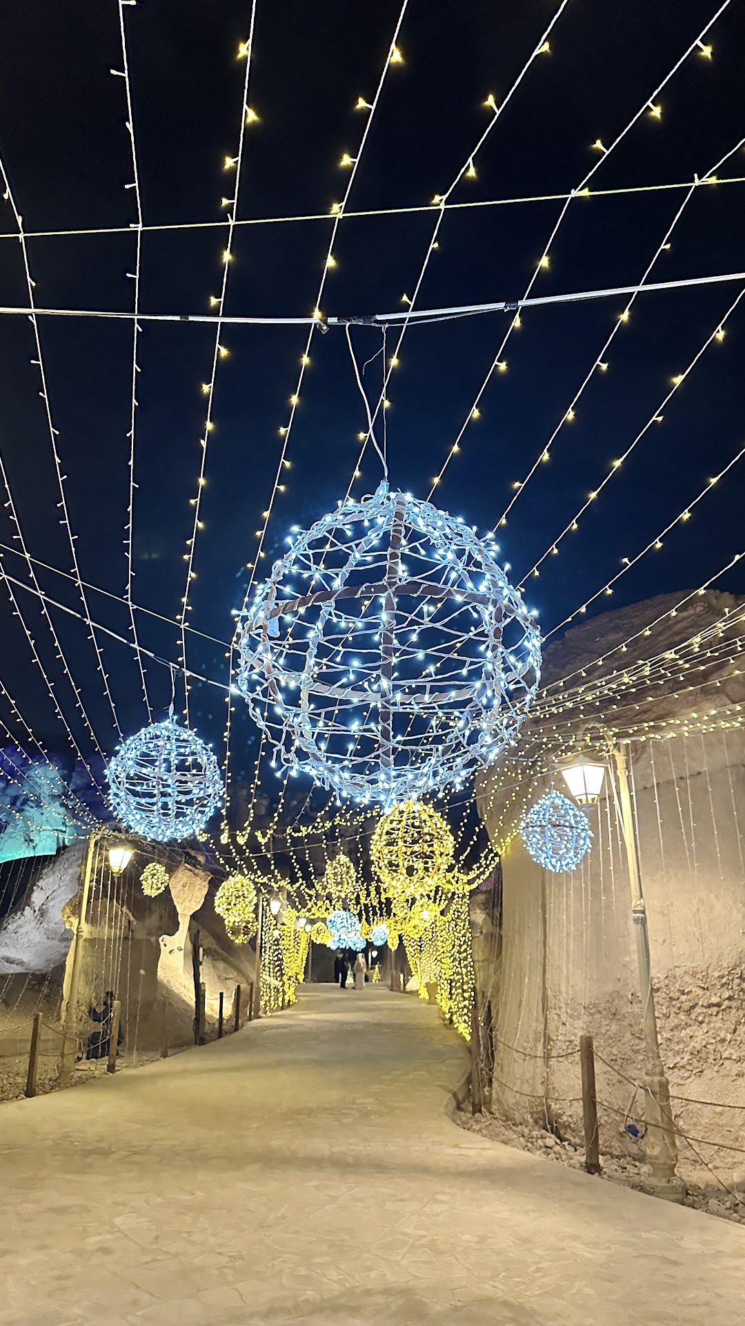 Once you are through 3-4 rooms of artifacts, you then walk into an open pathway which leads you to the hills and caves. This pathway is beautifully lit up. We then proceeded to the hills and then to the caves. All throughout, it was well lit up in multiple colors which added to the beauty of the hills. The caves were lit in one color to make the navigation easier. You do not feel any suffocation (for those who are claustrophobic). In fact, it felt cold and a bit windy as we walked through the caves/in between the hills (we went during mid-March).
