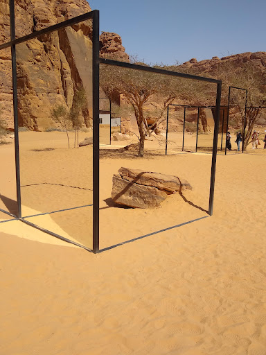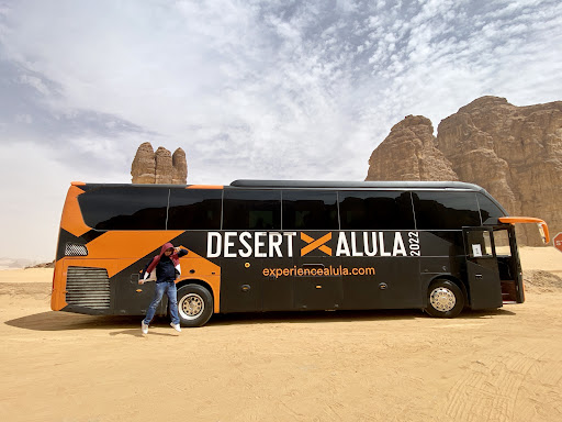 The long version: The approach to the new location of Desert X in Al Ula, Saudi Arabia is a work of art in itself. With wind carved stone cathedrals stretching in every direction it would be easy to wander off into the maze of slot canyons that worm their way through the desert. Fortunately the Google Map pin is spot on, the turn off from the highway is clearly marked and there is plenty of signage and friendly Saudis waiving you onwards; to the parking lot where a collection of buses, mini vans and SUVs are ready to take you on the next leg of your journey. Less than 10 minutes later you are deposited at the visitor center where you are given a quick orientation in English and Arabic, offered water and a map and invited to wander into the desert (or take advantage of a driver and off road land cruiser or quad). It is as fun as it sounds!