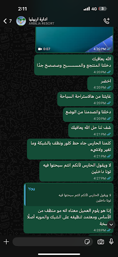 ثالثًا: التعامل سيء من صاحب الاستراحة والحارس بدال ما الواحد يحسن، يبررون تبرير غير منطقي يقول عطيتونا ملاحظاتكم بعد ساعتين من دخولكم، الظاهر يبينا نطلع بعد ما تجمعوا العوائل كلها