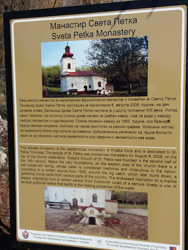 Read moreOvaj ženski manastir je najzapadniji fruškogorski manastir i posvećen je Svetoj Petki Trnovskoj.Hram Svete Petke proglašen je manastirom 8.avgusta 2008.godine na dan crkvene slave.Današnja Crkva Svete Petke nastala je u drugoj polovini XIX veka. Ispod samog temelja na istočnoj strani crkve nalazi se uređen izvor,čija se voda u narodu smatra lekovitom i čudotvornom.Prema pisanom izvoru iz 1863.godine oko brvnare,koja je kasnije izgorela,okupljao se narod pristigao iz raznih krajeva.Uklesani natpis na mramornoj ploči,koji potiče od izvesnog Dubrovčanina izlečenog od teške bolesti jedan je od nekoliko natpisa zahvalnosti koji svedoči o ...