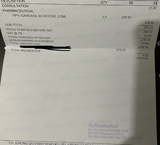 Seems like I got scammed for the gardasil-9 vaccination. They sent an email stating that the total cost will only be $619.20. The receptionist/cashier told me to either bill 3 separate times as there’s a total of 3 shots to take in different months. Or pay one shot, the total bill will be same amount. So obviously I choose to pay 3 separate times. The bill came out to be $278.70, * 3 would be $836.10. More than 200$ above the mentioned price in their poster. I questioned the receptionist about the 600+$ promotion, but she said it’s more expensive due to consultation & tax, in this case the clinic shouldn’t had stated $619.20 such an exact amount, should just put 800$+? The receptionist also mention that the 2nd & 3rd shot would not require to pay consultation fee so would be cheaper (haven’t took yet so I can’t confirm this. Not sure why I have to pay consultation fee as my company always cover the consultation fee for us. But she didn’t allow me to pay thru my company). After I went home and check, the exact price they are charging me for 1 vaccination without tax/consultation is $239.50 which will amount to a total of $718.50 (still $100 more than stated price). Also, I’ve just received a letter from HPB (health promotion board) that HPV vaccination can be paid using Medisave, however, I was only allowed to pay using card or cash at raffles medical. I have also emailed the corporate raffles medical email to follow up about this but there’s no response from them for a week. Disappointing.