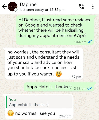 I tried the trial service. I had trouble initially communicating with my assigned hair consultant as I didn't speak Mandarin but there was another staff who kindly translated for me. My consultant was very sweet and explained the process thoroughly :)