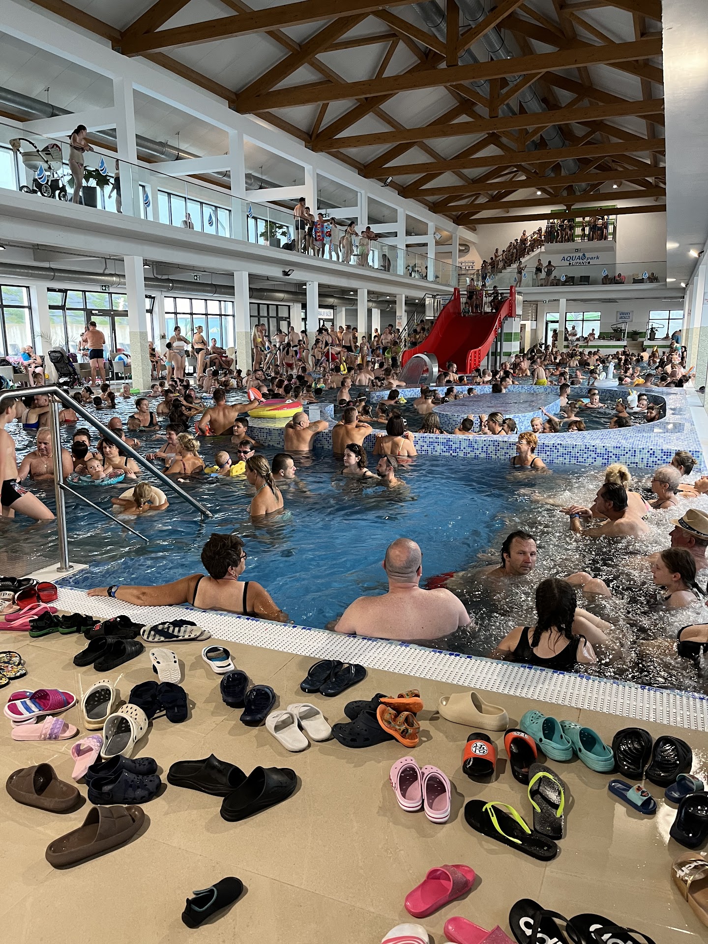 Rude staff overall, yelling at you that can't sit in the kids' swimming pool, playing with your kid , when asked why, was told that the difference in ph. Now , either shut off access to the swimming pool entirely, and keep there only little kids, or stop enforcing this stupid rule, because the pool was overcrowded by older kids that have been to slides, thermal pool etc. Even our little 2.5 years old daughter was in all the pools there.