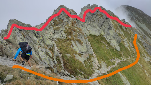 Ogólnie ten szlak czerwony, zwany słowacką Orlą Percią, poza tym, że jest krótszy, mniej męczący i łatwiejszy technicznie, ma jeszcze wzgl Orlej takie różnice: Wyżej wspomniana wielowariantowość podejść oraz liczne opcje obejścia trudności - prawie każdą trudność można tu łatwo obejść bokiem/dołem, łańcuchy też. Na Orlej w wielu miejscach to niemożliwe Za OR, już od Płaczliwego, zaczynają się koliby, po kilka na każdej przełęczy i szczycie, dobrze wykonane, nie burzone. Na Orlej brak. Od Smutnej Przełęczy trzeba uważać na oryginalny przebieg szlaku. Coraz częściej zaczyna pojawiać się po lewej stronie ścieżynka wśród traw, o alternatywnym biegu, omijająca co tylko się da. Szlak coraz częściej biegnie po prostu granią, a ta opcja dla niedzielnych turystów poniżej może kusić słabych albo ściągać nieuważnych. Nie możesz powiedzieć, że szedłeś czerwonym szlakiem z Rohaczy na Banówkę, jeśli nim nie szedłeś, a zamiast tego obszedłeś go 25m poniżej, ścieżynką wśród traw, omijając wszelkie trudności i na dalszym odcinku nawet nie widziałeś już czerwonych oznaczeń. Już na długim odcinku okolic Smutnej Przełęczy są miejsca, gdzie oryginalny bieg szlaku i owa harpagańska perć rozdzielają się. Kulminacja jest przy podejściu na Banówkę te trasy rozdzielają się na dobre i albo wszedłeś szlakiem na Banówkę (po oznaczeniach, granią za 0+, ale nawet z miejscem jedynkowym, a więc trudniej niż Orla Perć i bez sztucznych ułatwień) albo też wcale nie zrobiłeś szlaku, a Banówkę zdobyłeś na "lewo" - nawet dosłownie, bo harpagańska perć dla trzylatków biegnie właśnie po lewej stronie grani. Zbędność sztucznych ułatwień. Na Orlej są miejsca, gdzie chcąc trzymać się oryginalnego przebiegu, musisz użyć ułatwień (np. drabiny w okolicy Koziej Przełęczy). Na Rohaczach nie ma takich miejsc, każdy fragment szlaku może być łatwo zrobiony bez dotykania żelastwa, bo nie przekracza 0+ (w jedynym miejscu jedynkowym - jest ono na grani przed Banówką - ułatwień...