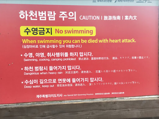 Inscription System The Sign uses bold colours like red and yellow, with yellow as the highlighted colour to show the main message of no swimming! The most important message “When swimming you can be died with heart attack”, though in broken english, is interestingly placed before Korean, perhaps because more tourists than Koreans visit this place
