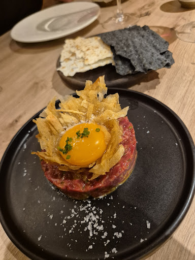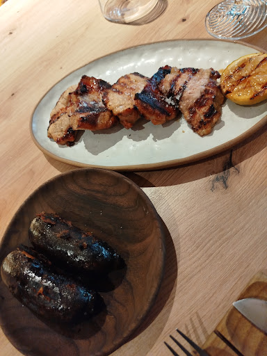 Muy buen sitio de carnes en Coruña. Llegamos ahi de casualidad. Al principio nos asustamos porque tiene pinta de ser muy caro, pero nada mas lejos de la realidad. Entras y lo primero que te traen despues de pedir es empanada y pan con mantequilla ahumada con aceite ahumado (coste 1.80€ por persona), muy muy bueno y de calidad. Hay un chico que te enseña diferentes cortes de carne fuera de carta en caso de que te puedan interesar. El sumiller te asesora perfectamente con el vino, tiene amplia variedad con diferentes precios, pero no tienen carta de vinos como tal, sino que te asesoran en la propia mesa segun tus gustos. Nosotros pedimos para cenar de entrante puerros asados con mantequilla trufada y bacon, increíbles de sabor, junto a una berenjena asada con burrata, también impresionante. En cuanto a carne me entristeció que no tuvieran entraña (no les quedaba), asi que pedi pollo, y madre mia que pollo!!!! Perfectamente marinado y hecho en brasa, super tierno y con un sabor increíble. Pedimos también churrasco, delicioso a la brasa también y con muy buena cantidad (en general los platos son grandes). Los postres no probamos porque estabamos ya llenos, pero seguro que visto lo visto estarán increíbles también. El servicio por parte del personal es excelente, de un sitio de categoría. Total de la cena 61€, y muy bien gastados, ya que lo disfrutamos mucho. Por poner un pero, hacia bastantr calor, si que es verdad que estabamos sentados bastante cerca de la parrilla y seguramente seria por eso asi que no le dimos importancia, pero el calor era notable. Sin duda cuando vuelva...