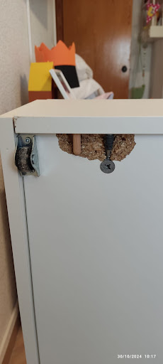 Adjuntamos fotografías con las pruebas, en las que se puede ver claramente los daños ocasionados por la instalación, queriendo destacar también la dudosa calidad de los materiales, como tiradores que se desajustan al tocarlos o las ruedas de plástico que se aprecian completamente dobladas por no ser de una calidad suficiente para soportar el peso de una persona.
