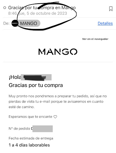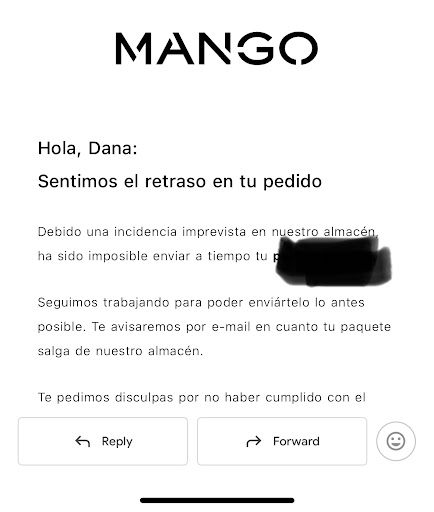 Compré una camiseta la cual al no tener tallaje la tuvieron que pedir dicho pedido se realizó el 3/11/20, al día siguiente me mandaron un correo que se había realizado el pedido, a los dos días recibí otro que el pedido salía del almacén para dicha tienda y que al llegar recibiría otro correo avisando para pasar a recogerlo, como éste no llegaba pasea preguntar por la tienda y la respuesta ha sido haun no lo recibimos, a la semana siguiente volví a pasar y la respuesta fue, lleme el próximo martes día 24 que es hoy, una vez realizada la llamada la contestación fue, aún no ha llegado, llamé al tfn atención al cliente y le dirán donde está y cómo está su pedido, llamé a dicho tfn y no supieron decirme dónde se encontraba mi camiseta, fui directamente a la tienda y pregunte por la persona responsable es se llama ALEXANDRA la cual es MUY DESAGRADABLE y después de un rato localizó dicha prenda que la tenían en su tienda, el fallo ha sido que cuando pidieron erranro en alguna letra de mi nombre y por ello que no localizaban, esta señora ALEXANDRA no solo no pidió disculpas sino que se metió para dentro dejando a su empleada lidiar con el problema. NO VOLVERE COMPRAR NADA EN MANGO POR CULPA DE ESA DESAGRADABLE E IRRESPONSABLE QUE ES LA...