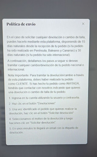 Por si fuera poco, la guía de tallas publicada en su página web no corresponde con la realidad de los vestidos adquiridos, ya que estos resultaron ser significativamente más pequeños de lo indicado. Esto se debe, según se ha podido constatar posteriormente, a que los vestidos eran prendas usadas y confeccionadas a medida para modelos, un detalle que no fue actualizado ni especificado en la descripción del producto. Para descubrir esta información, el cliente se ve obligado a investigar en otra sección de la página web, específicamente en las políticas generales de devoluciones, donde se menciona de manera indirecta. Esta falta de actualización en la información y la necesidad de buscar en secciones poco accesibles reflejan una clara intención de ocultar la verdadera naturaleza de los productos ofrecidos, lo que constituye un engaño al cliente.