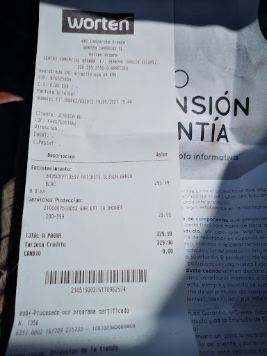 Read moreHe estado en lanzarote durante 16 años y a menudo he tenido buenas experiencias antes de comprar electrodomésticos en Worten, pero la última compra fue muy mala. Lo que quería comprar era una scooter eléctrica y al principio me recibió una vendedora mayor que me dio todos los detalles que quería, la velocidad máxima de 25km. Una seguimiento 30km, cuando estoy pensando, Ella le dar servicio a otros invitados, se procedió a UN hombre de gafas.David., con él dijo que quiero El scooter eléctricaque esta mostrar el escenario. despues El me traer una caja de descooter eléctrica cerrada.tambien sentado El Lo tarta mucho cuando se hace el pago con los ordenadores , parece no sabe nada.finalmente se llama una vendedora para ayudarle , entonces esperé mucho tiempo, Pero entiendo por a lo mejor que El es nueva vendedor.le digo no pasa nada. ¡Entonces comienza la tragedia! Cuando llegué a casa cocinando, mi marido armó la scooter eléctrica y se sintió UN poco pequeño, pero decidió a probamos.porque vivimos en playablanca. Sería demasiado molesto ir otra vez a cambiar a otro modelo.antes de que nos diéramos cuenta de que habíamos tomado la mercancía equivocada. Después de que mi marido probó el paseo durante 2 días, 7 kilómetros al día, dijo que no estaba bien, que la velocidad máxima sólo podía alcanzar los 15 kilómetros, que sólo conducía 7 kilómetros al día, pero que cada noche tenía que recargar la carga para llegar a casa. So i brought the electric scooter to the worten store the first time in the morning of the third day and compared it to the previous guy, David, who wore glasses. Él me dio otro modelo y una de las empleadas en el interior me dijo que ya lo habíamos usado y que no podía ser cambiar! No tiene sentido, en total solo usamos scooter eléctricos de menos de 20km, además, fue el error de su empleado primero y no me dio la mercancía que pedí, ¿Por qué no puede ser reemplazada? También he rellenado el formulario de reclamación y ahora estoy esperando su respuesta! Fue una experiencia terrible, 300 euros no compró placer, sino enojo, y el precio del combustible para varios viajes de ida y vuelta de playablanca a arrecife. también tenía que trabajar todos los días y tenía que tomar 2.3 horas cada vez para resolver el problema. Me sentí engañado de principio a fin, desde el principio me dieron UN producto de la misma marca pero diferente, y era UN producto malo. probamos sólo dos días y no quisimos reemplazarnos. no pedí ningún reembolso, sólo el cambio del producto...