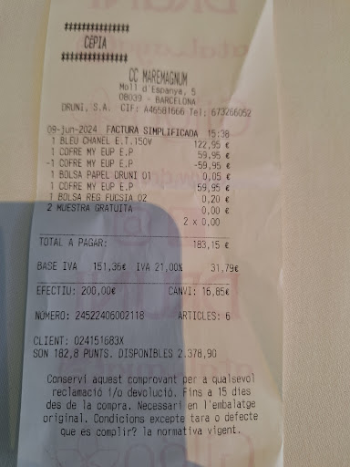 Read moreJ’ai vécu une expérience très décevante dans ce magasin. Le 21/08/2024, j’ai acheté pour 260€ de parfum, dont le Zadig & Voltaire “This is Her”. Une fois rentrée chez moi, j’ai constaté que le parfum était de couleur jaune, ce qui m’a énormément surprise car je l’achète depuis 5 ans et je n’ai jamais vu un flacon de cette teinte. À noter que le parfum du testeur en magasin était bien blanc, comme tous ceux que j’ai achetés auparavant.