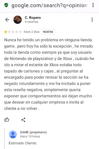 Read moreHace años que soy cliente de GAME, siempre me han atendido muy bien y nunca he puesto reseñas, pero hoy me veo obligado a hacerlo para evitar que prospere la mentira y la mala fe de algun que otro usuario caprichoso que mienten sin tener en cuenta las consecuenciasque pueden acarrear sus mentiras. En concreto, lo que voy a escribir es referente a la mala reseña puesta por "C.Ropero", de la cual adjunto una captura de pantalla. Ese día al cual se refiere este señor, el dependiente, de nombre Gustavo, me estaba atendiendo a mi muy amablemente solucionándome un tema con un pedido online que yo había hecho. Podéis imaginaros en estas fechas cómo estaba la tienda, y la paciencia que debían tener los dependientes, atendiendo a la gente y entrando y saliendo continuamente del almacén de la tienda con género para los clientes. Bueno, pues como ya he dicho antes, Gustavo me estaba atendiendo, cuando sin ni siquiera pedir permiso para interrumpirnos, éste señor se mete enmedio de nuestra conversación, y señalando unos carteles y cajas que estaban entre una estantería y el acceso al almacén de la tienda, le dice a Gustavo "Perdona, aparta estos carteles y cajas de ahí porque estoy buscando un producto y necesito ver lo de esa estantería" (Yo me quedé perplejo de la cara que tenía éste señor, y sus malos modos). Gustavo, con mucha educación le contestó "Lo siento, pero de momento no podemos quitar esas cajas y letreros, pero si está buscando algo en concreto, cuando acabe de atender a este señor (se refería a mí) le atenderé gustosamente. La respuesta del otro me dejó todavía más perplejo que antes, le contestó lo siguiente "Trabajo con GAME y pongo opiniones en Internet, y si no haces lo que te he pedido tendré que ponerte una mala reseña"😱. Gustavo, sin perder la calma le contestó "Haga lo que crea oportuno, ya le he dicho que sintiéndolo mucho, de momento no podemos apartar esas cosas, pero que si necesita información de algún producto nuestro, le atenderé gustosamente cuando sea su turno " El otro se fue de la tienda maldiciendo y amenazando con poner una mala reseña, lo cual ha terminado haciéndolo. Yo, continué hablando con Gustavo para solucionar mi problema, y debo decir que lo consiguió, tanto por su profesionalidad cómo por su buen trato y paciencia. Que cada uno tome sus conclusiones, yo tengo claro que volveré a esa...