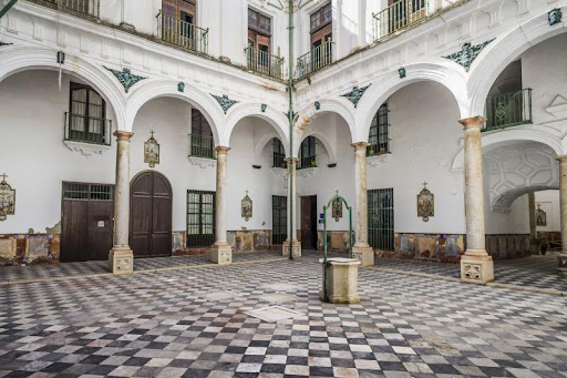 El interior se dispone en torno a dos patios comunicados, entre los cuales se alza una imperial escalera, que cabe destacar que ahora está en obras, y a nosotros nos fue imposible poder verla.