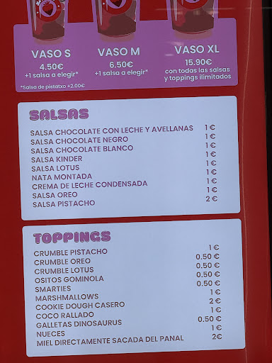 Read moreHoy por la tarde fui a este local con una amiga a probar las fresas con su siropes y topin ! Bajo mi humilde opinión las dos chicas no estaban bien organizacidas y esto ocasiona largas colas y largas esperas ! Es un producto que se sirve rápido , se echan varias fresas en un vaso que ni siquiera las trocean y dificultan al comerse , echar un chorreon de sirope y el topin y ya está listo ! Veo falta de personal para la demanda que hay y el precio es caro ! Por último podrían poner afuera un cartel informativo de los precios y diferentes salsas y topin para que la gente ya entren a la tienda sabiendo lo que quieran ! Esta claro que no voy a repetir Y la verdad no entiendo que allá gente que diga en las reseñas que son baratas 4 fresas en un baso pequeño con un chorreon de sirope y topin 4,50 € más lo que te cobran por los topin ! Hay dejo la tabla de precios para no engañar...
