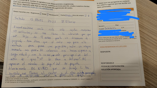 La responsable de "Atención al cliente" que estaba atendiendo de cara al público en E.Leclerc de Salamanca el día 8 de octubre de 2021, sobre las 13 horas, dio un trato vejatorio a mi madre cuando tuvo que acudir a solicitar ayuda por una negligencia del personal de dicho establecimiento. En concreto, lo que sucedió es que a mi madre se le cayeron varias latas de Coca-Cola en la cabeza, al pasar cerca de esa estantería, porque dichas latas no estaban correctamente colocadas. Como consecuencia del impacto recibido, comenzó a sangrar su frente. Nos dirigimos al mostrador de "Atención al cliente", y lejos de encontrar a una persona amable que nos proporcionase un botiquín con unas gasas y un poco de desinfectante, hallamos a una persona con cero empatía, que no solo no ayudó (ni hizo lo más mínimo por ayudar) a mi madre, sino que la humilló con sus palabras, con una hostilidad intolerable. Debido a que la hemorragia producida por el impacto iba a más, fuimos inmediatamente al hospital, y hay informe médico y parte de urgencias. Por fortuna, ha pasado ya un tiempo, mi madre ha evolucionado favorablemente y ya se encuentra bien... Pero podría haber sido muchísimo más grave. Y el dolor y el daño sufridos por mi madre son irreversibles. No hemos querido tomar medidas legales, a pesar de tener pruebas concluyentes para exigir responsabilidades. Con esta reseña, tan solo queremos evitar que esto pueda volver a suceder en el futuro a otros clientes. Por ello, rogamos que se preste especial atención a la colocación de la sección de refrescos. Y, por favor, que la señora o señorita que se encontraba trabajando de cara al público en "Atención al cliente" en esa fecha y a esa hora, sea más amable, más empática y más profesional con otros clientes, de ahora en adelante. Tener personas así en su plantilla daña el prestigio y la imagen corporativa de un establecimiento de reconocida calidad y...
