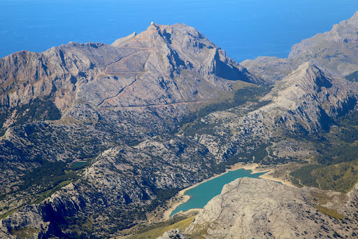 Read moreEn la maniobra de aproximación para tomar tierra en el Aeropuerto de Palma, cuando se encuentra en configuración sur, se desciende en dirección NE, en paralelo a la Sierra de Tramontana, y se puede observar con gran nitidez, a babor, la cumbre del pico Puig Mayor, que con sus 1436 metros sobre el nivel de mar es la mayor altura de las Islas Baleares. La cumbre se reconoce muy fácilmente porque tiene instalada una especie de esfera que contiene unos radares del ejército del aire. El acceso a la cumbre debe hacerse mediante autorización que hay que solicitar en la base militar. Una carretera traza un brusco zigzag sobre a ladera de la montaña hasta la cumbre. En la base de la montaña se aprecian dos embalses, el de Cúber y el de Gorg Blau. El paisaje cultural de la Sierra de Tramontana fue declarado Patrimonio Mundial de la UNESCO en 2011. Es una sucesión de montañas y cañones profundos escavados en el macizo calcáreo que geológicamente se puede considerar una prolongación del sistema bético. Sorprende la escasa vegetación de las partes altas, típica de estas islas...