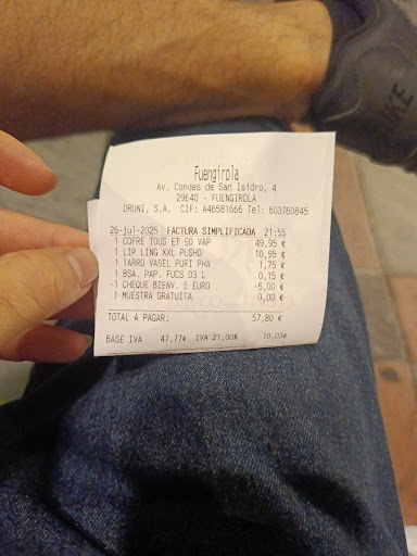 Read moreMi reseña es sobre los pedidos ONLINE. Os aconsejo que NUNCA realicéis pedidos online en la web de DRUNI. Me enviaron un producto equivocado y el SISTEMA DE DEVOLUCIÓN es ENGAÑOSO por excesivamente complejo provocando finalmente disuadir a los clientes y no permitiendo ejercer sus derechos. En primer lugar, no permiten la devolución en tienda, ni siquiera contando con el ticket y número de pedido; no es posible hablar con nadie mediante el teléfono de at. al cliente; no responden al correo electrónico, y el formulario web de devolución es un timo, ya que cancelan la devolución, impidiendo así continuar con el proceso o poder realizar la devolución en tienda. Solicitan que envíes fotos del producto, ¡incluyendo del plástico de burbujas y la caja! Y repito, todo esto por un producto que compré y que ¡ellos me enviaron erróneamente! Es una estafa y atenta contra los derechos de los consumidores. Por último, me gustaría aclarar que las asistentas de la tienda de Fuengirola son muy amables, pero desgraciadamente no pudieron ayudarme, ya que esto no depende de ellas, sino que es política de la empresa y el departamento de atención al cliente, en todo caso....