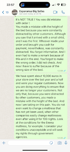 addition to the review from 12 Nov. thank you for your response, especially in such excellent English. whereas all your employees previously refused to speak English to me. moreover, another week has passed and there is still no solution to the problem either from Esperanza or from your other employees who know about the problem of you refusing to take away a low-quality mattress. And no even apology from you for the Esperanza mistake of the height of the bed I have to take this pain myself now. My visit to the store I was promised that the store director Natalia would contact me, but she apparently decided to ignore the problem too. I have a very small child and I do not have the physical ability to go to your store as to work in order to somehow draw attention to the problem that you resolutely ignore as a company. you block me on social networks and delete my comments. fortunately, google does not allow you to do this. just as government agencies like OMIC or Agencia Tributaria will not allow you to do this, because you cannot endlessly avoid the problem and...