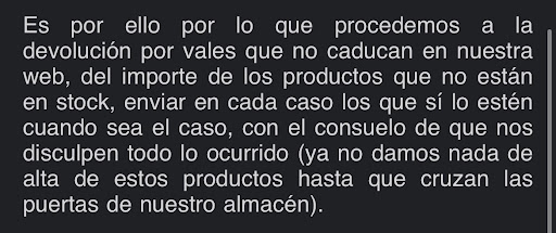 No puedo describir el agotamiento con todo este proceso online, para algo tan simple como es que te hagan un reembolso de un producto que ellos mismos saben que no van a llegar… encima en el correo con el vale me decían que habían tenido problemas con su atención al cliente por el apagón a finales de abril el cual yo respondí que mis primeros intentos de contacto fueron el 4 de abril, varios días antes de dicho apagón, y continué escribiendo durante semanas sin obtener respuesta, lo cual demuestra una falta de atención prolongada que no puede justificarse con el incidente técnico mencionado.