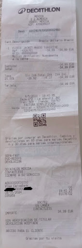 Read moreLamentable mi experiencia en Decathlon Mérida, concreatamente con el guardia de seguridad (por lo que veo en comentarios no soy el primero). Soy cliente habitual, y compro mucho allí. El 14 de marzo compré un paraguas. Una de las cajas no funcionaba con tarjeta y el guardia de seguridad me dijo que pasase por otra (el paraguas en la mano en todo momento). Pague mi paraguas, cogí mi ticket y salí de la tienda. Cuando ya había salido del perímetro del aparcamiento e iba por la calle con el coche, el guardia de seguridad sale corriendo detrás de mi coche, me hace parar en mitad de la calle y me dice que no he pagado el paraguas (situación que además de ridícula es totalmente ilegal). Le enseño el ticket y al ver que estaba todo correcto se da media vuelta sin pedir ningún tipo de disculpas. Evidentemente doy la vuelta y entro a poner una reclamación a la tienda. En todo el largo rato que estuve poniendo la reclamación, la actitud del guardia de seguridad fue chulesca y altiva. Un mes después me ha llegado una notificación de Decathlon en la que dice que el hecho no vulnera mis derechos básicos. Aunque se que es una nimiedad, han...