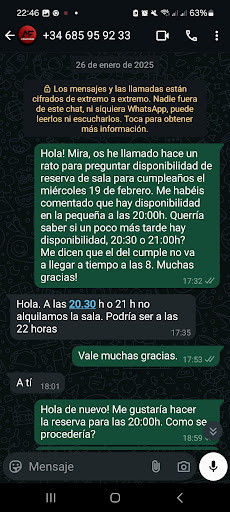 Read moreReservé una sala para el 19/02 a las 20:00, confirmada tanto por teléfono como por WhatsApp. Al enviar el justificante de la transferencia por email, cometí un error al indicar por escrito la fecha 10/02 (aunque en el resguardo y en el concepto del pago del email volvia a indicarse 19/02).