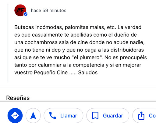 Actualización: Acabo de leer tu respuesta por aquí como quien lee una broma de mal gusto. Esto pasó hace semana y pico. Veo que solo quieres desviar el foco de tu cuestionable gestión con esta teoría persecutoria. No sé a quién llamas competencia, pero dice mucho de ti cómo hablas de esa gente que trabaja en tu sector. De nuevo, cero respeto. Nos encanta ir a cines, pero ni mis amigues ni yo volveremos a contribuir al negocio de una...