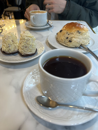 Read moreComo todos los lugares que por las redes sociales se hacen virales, lo mejor es ir un día entre semana o a unas horas a las que no vaya todo el mundo para evitar aglomeraciones, especialmente en esta cafetería, que es preciosa pero tiene unos huecos muy reducidos entre mesas, así que si queréis tomaros lo que pidáis sin chocar los codos con la mesa de al lado, seguir ese consejo (cada vez dan menos ganas de visitar lugares que aparecen en redes). Como he señalado, el lugar es muy bonito pero para mi gusto hay demasiadas mesas, si redujeran la cantidad los clientes estarían más a gusto. El personal es amable y atento. Puedes ver cómo hacen los pasteles y bollería mientras pides en el mostrador (hay que pedir primero y luego sentarte en la mesa, por eso es recomendable evitar días y horarios en los que vaya mucha gente). Nosotros pedimos el brioche con pepitas de chocolate, el merengue de praliné y el de caramelo, con un café mokka y un capuccino. No le doy más estrellas porque los merengues fueron una decepción. El de praliné solo sabía a almendra y azúcar pura, el de caramelo bastante mejor, pero nada del otro mundo. A mí me encanta el merengue y no noté ni la textura ni el sabor. Mi café mokka estaba bueno, pero el capuccino no lo era, era un café con leche, ya que no tenía crema de leche (y el capuccino no lleva leche directamente). El brioche sí se salva. Muy bueno de sabor, blandito y con buena cantidad de pepitas de chocolate. De precio, un poco caro para la calidad que ofrecen, 14.30 todo. Volvería para probar los gofres, pero por el momento no lo añadiría a lugares que recomiendo. Hay mucho...