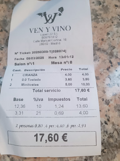 Read moreA lovely night took an unexpected turn when we noticed an unlisted charge on our bill. I've lived in Madrid for 6 years and my friend for 14, and in all our time here, we've never encountered a corkage fee at a wine bar/restaurant—unless bringing our own bottle. Yet, we were charged 5 euros per bottle simply for ordering wine from their menu. This fee was neither posted nor mentioned beforehand. When we questioned it, the charge was removed, but it felt like it was added under the assumption that we were tourists. Madrid is my home, and I want to warn others: if you order a bottle of wine here, check your...