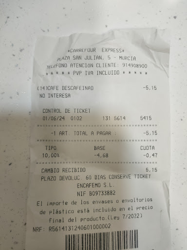 Esta mañana he ido a comprar a unos de sus supermercados, en concreto a un Carrefour express que está ubicado en Plaza San Julián 5 (30004) Murcia.