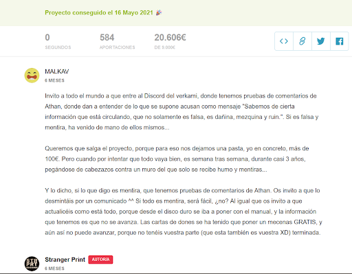 Read moreSoy mecenas de su proyecto de Verkami, un juego de rol con muy buena pinta que logró recaudar más del doble de su presupuesto y del que, tres años después, solo hay humo, muy mala experiencia, gente muy maleducada y nada profesional, en teoría iban a hacer directos, comunicados, presentar supuestos avances (Que hayan hecho en los últimos años de retraso) pero nada, no sabemos nada del proyecto, no hay imágenes, no hay directos y probablemente no haya dinero para devoluciones que ya dijeron que no haría hará 1 año, para eso si fueron rápidos, no como la información que iban a poner el mes pasado sin falta. Sé que esta puede no ser la plataforma para ello, pero ignoran deliberadamente las "oficiales" y resulta frustrante vivir en cámaras de eco, tal vez esto les salpique un poco y no sea hablarle a un muro que solo te escupe...
