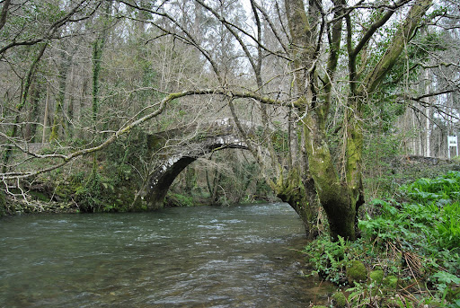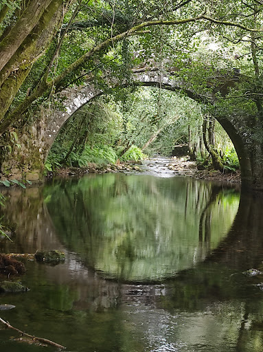 Encantador puente en una aldea cercana a serra de outes al lado de noia...es un puente de poco mas de un siglo por el que cruzar el rio tines...las riberas son muy espesas y tiene pinta de tener buena pesca en los alrededores....no tiene aparcamiento o sea que donde se...