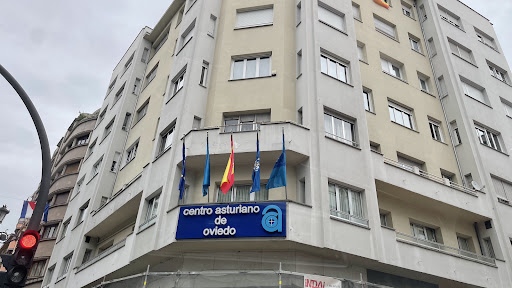 Centro Asturiano de Oviedo, en la cai Uría, 18, primer piso (Uviéu). Institución histórica con dos sedes sociales: ésta de la calle Uría y el club de campo en El Monte Naranco. Su origen se circunscribe al movimiento migratorio de la segunda mitad del s. XIX, cuando numerosos asturianos se trasladarón a Hispanoamérica, en especial, a la Cuba española, en busca de un futuro mejor. Los lazos de solidaridad y el amor a la patria fundamentaron la creación del Centro Asturiano de La Habana (1886), cuyo empuje llevó a la creación de delegaciones en los numerosos lugares donde había asturianos como New York, Tampa y por supuesto Oviedo. La delegación del Centro Asturiano de Oviedo nació como sanatorio, que acogiese a emigrantes retornados a Asturies, enfermos o sin fortuna, eligiendo (1928) por sus favorables condiciones El Monte Naranco como ubicación del centro, que llevaría el nombre de 'Delegación del Centro Asturiano de La Habana'. Se construyó el sanatorio y una casa social de recreo y estaban proyectadas más edificaciones, pero la revolución d'ochobre 34 y la guerra civil impidieron que se ejecutasen; período de crisis de la institución que se agravó aún más con el triunfo de la revolución cubana del 59. En 1967, los asturianos del Centro de La Habana decidieron el cambio de nombre de la entidad, que pasó a denominarse 'Centro Asturiano de Oviedo', a quien pasó la propiedad de los terrenos d'El Naranco, lo que no impidió el declive que propició casi su cierre en los años 70, que los ovetenses y un cambio de comisión gestora logró impedir. En los 80, aparece la institución, recuperada y consolidada, con miles de socios. Junto con estrechar los lazos de unión con otros centros asturianos, americanos y españoles, organiza actividades culturales y deportivas en sus instalaciones. Las instalaciones de la calle Uría tiene salones de lectura, juego, billares (chapó y chapolín), biblioteca, cafetería,...