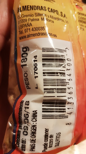 I bought Cacahuetes which schould be eatable till 8 month in the future. I tasted them, ranzios, sorry realy bad peanuts from china. I gave to the shop attendant from lluc to taste and to other aborigines from Mallorca. All of them shocked of the bad taste. I visited the Production location with shop at Palma. They changed the rancid package. Now I have in direct compair peanuts from Holland, Duyvis, far the best taste. From Zaragoza, Xanos, eatable but not good. Finaly Capo Cacahuetes, even the peanuts from new pachage taste bad. Perhaps they use Chinese bad...