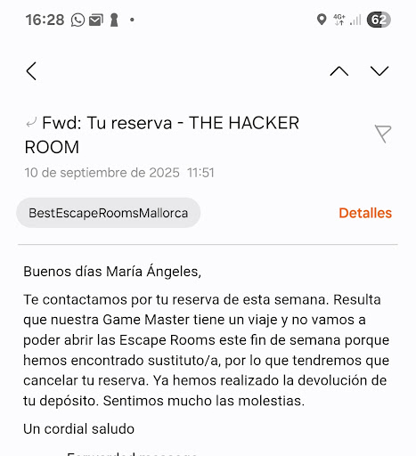 Read moreEn general el sitio esta bien, para pasar un buen rato con los amigos o la familia, ya que el juego es divertido, pero la verdad es que es una estafa y el personal tendría que mejorar su comportamiento con la clientela. Fuimos unos amigos y yo, y reservamos una sala por internet y nos pedía un deposito de 20€ por la reserva, al día siguiente fuimos y le preguntamos al hombre que si nos devolvería el deposito en efectivo o por vía banco y el hombre nos respondió "Yo nos os debo dinero, vosotros me lo debéis a mi" y desde ese momento el trato con él fue muy difícil, ya que nos trato como unos niños pequeños que no nos enterábamos de nada de como funcionan los depósitos y nos decía que no había ningún que devolver, así que eso nos jodió la experiencia desde el principio, además de que este hombre era un borde y nos respondía mal. Espero que ya lo hayan despedido o le hayan dado un toque de...