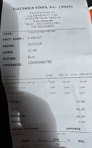 Read moreUna estrella porque no se puede poner ninguna. Compré un cargador de batería 12V/1A a un precio absurdo, 35,50€. (En Amazon los hay digitales de 6A por 18€! De haberlo sabido. Pero hasta hoy, creía en el pequeño comercio. Se acabó!). Lo conecté tal y como el vendedor me dijo y la luz que tenía que encenderse, nunca lo hizo. Vuelvo a la tienda a devolverlo/cambiarlo y me dicen que está quemado y que lo he quemado yo!! Nunca llegó a funcionar. Por si era poco, una caja de conexión faston de dos polos que cuesta en Amazon 0,72, me cobraron 2,60€! Esto no es comerciar, es otra cosa. Pongo denuncia en consumo. Y se acabó la pequeña empresa para mí. Les he dado demasiadas oportunidades...