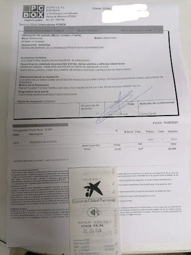 Al probar el ordenador en casa, pues sí, ya no mostraba imagen, pero el ordenador encendía, ¿ok? ¡El ordenador iba PERFECTO antes de darlo a esta gente!! Pues hemos tenido que llevar a reparar nuestro ordenador, donde lo hemos comprado porque es un ordenador pre-montado y con garantía de 3 años del MediaMarkt. Una vez que lo repararon, dijeron que cambiaron el microprocesador y la tarjeta gráfica y dicen que hicieron unos tests al ordenador después de la reparación. O sea, una cosa no tenia nada que ver con la otra. ¿Al final? El ordenador funciona ahora... MediaMarkt tuvo razón - fueron la tarjeta gráfica y el procesador que fueron dañados y todo por culpa de PCBox. PCBox se ha completamente equivocado de porque el ordenador ya no iba, se lo habían cargado ellos. Ha sido una perdida de tiempo y una estafa. La mano de obra no nos la rembolsarán, hemos pagado una mano de obra para que se carguen el ordenador en vez de mejorarlo.