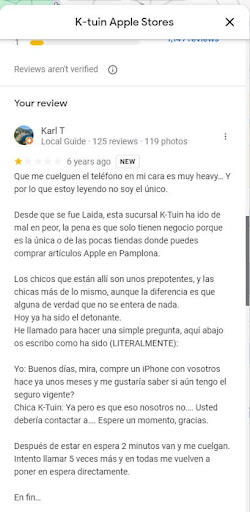 Comienzo... He solicitado reparación con Apple Care y aún habiendo varias opciones en Pamplona, por cercanía, me han enviado aquí, muy a mi pesar he decidido darles una oportunidad. Voy con una pantalla rota, (29€) la reparación. El de K-tuin me dice que al tener la pantalla y la parte trasera dañada tambien, que no puedo arreglar solo una cosa, hay que hacer las dos (58€) …..mentira. No obstante, acepto. Al rato me dice que además me avisa, que puede me cobren la tarifa de reemplazo (99€) ya que la de 58€ solo suele funcionar en Estados Unidos, que aquí a veces no la aceptan...?? En cuanto me ha visto la cara y que no tengo un pelo de tonto ha comenzado a decirme que intentaran que sea la de 58€ por su puesto.... A parte que si quiero reemplazo de teléfono, cobran una tasa de (19€) que Apple no menciona en su garantía Apple Care... no lo sé Rick...