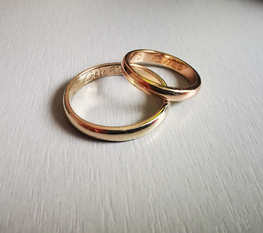 Estamos emocionados de compartir nuestra maravillosa experiencia en el taller de "María Grazia" creando las alianzas para nuestra boda. Desde el primer momento, sabíamos que queríamos algo único y significativo, y este taller superó nuestras expectativas. La creación de nuestras propias alianzas ha sido una experiencia muy bonita y que recomendaría a todos los novios, ya que como nos dijo Ina, simboliza de gran manera nuestra relación como pareja, comenzando con la fusión del oro familiar que llevamos y junto con el las vivencias de esas joyas y ver cómo se transformaba en algo nuevo y especial nos llenó de emoción, sabiendo que estábamos dando un paso importante en nuestro camino juntos. María hizo que las horas en el taller pasasen muy rápidas y ambos te hacen sentirte verdaderos joyeros, además están abiertos a todas las sugerencias que les hagas por difíciles que parezcan y están apoyándote durante todo el camino dando solución a las complicaciones que como novatos en la materia encontramos. Su pasión por el trabajo artesanal se reflejó en cada detalle, y fue un verdadero placer aprender de ellos. Las alianzas son siempre especiales ya que son el elemento que muestra esa unión como matrimonio, pero el valor de unas alianzas únicas creadas 100% por nosotros es incalculable darle forma poco a poco y personalizarlos completamente, desde la elección del diseño hasta el grabado de nuestras iniciales en cada alianza. Además, nos aseguramos de que ambas piezas se complementaran, simbolizando nuestra unión y el amor que compartimos, cada milímetro del anillo está plagado de detalles, todas las líneas y curvas cuentan una parte de nuestra historia y hacen que tenga un significado todavía más especial.