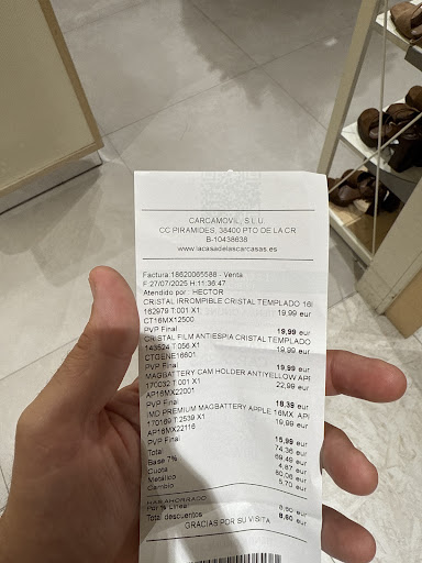 Read moreNos atendió ayer sábado un dependiente que se veía que estaba en otro sitio nos ofreció desde un principio un descuento de un 20% en los productos que nos llevaríamos compramos dos protectores de pantalla y dos fundas para iPhone 16pro Max finalmente hicimos la compra pero al llegar al coche nos cercioramos de que no teníamos ningún descuento aplicado en la factura volvemos a la tienda y nos dice que donde había descuento era en otro accesorio que nos ofreció después pues en una actitud desagradable nos comenta que era el gerente y que no nos había dicho nada de descuento pues con la duda nos vamos a Alcampo la villa y nos confirman que si se podía hacer el descuento lo que no lo hicieron.volvemos hoy domingo por que nos damos cuenta que el protector de pantalla no coincide con el modelo de móvil ya que deja la cámara delantera inutilizada un desastre. Hoy nos atiende un chico que si no me equivoco se llama Hector desde el primer momento nos tranquiliza y se dispone a solucionar el problema, comprueba que el protector no era el idóneo nos lo repone con uno nuevo y nos arregla el problema del descuento nos vamos satisfechos por gracias a empleados así no se para quiere encargados que nos arregla aportan si no malas experiencias de compra nos vamos contentos con el trato recibido por Héctor volveré a la casa de las carcasas gracias a...