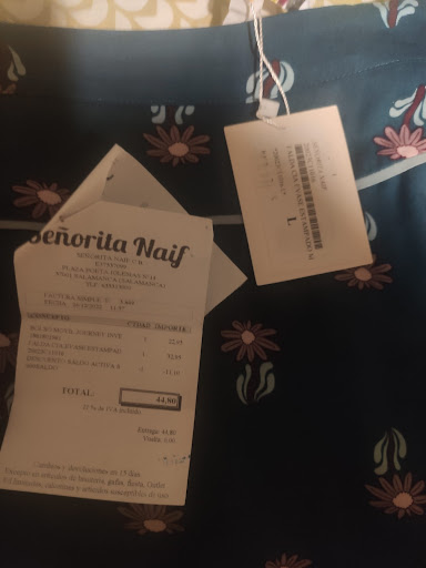 Read moreHe comprado varias veces en Señorita Naif y me gusta porque tiene ropa distinta, la atención siempre ha sido buena y es comercio pequeño, que lo priorizo por encima de las grandes superficies... Estaba encantada y la recomendaba a todo el mundo hasta el sábado pasado, día en el que fui a preguntar si podía devolver un artículo, aunque sabía que estaba fuera de plazo... No vivimos en Salamanca, pero vamos frecuentemente y casi siempre cae algo de esta tienda. Mi pareja me regaló una falda por reyes que me queda grande y cuando hemos vuelto a Salamanca fui a ver si la podía cambiar por otra.