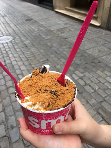 Read moreEl precio ligado a la tarrina está bastante bien, tarrina mediana 3€. En cuanto al personal, a día de hoy, hay un dependiente que me ha dejado la tarrina vacía, es decir, de los dos toppins que me trae mi tarrina mediana, ha puesto 5 conguitos contados y de la "salsa" avellana crunch media cucharilla. Estoy muy a disgusto porque he pagado 3€ para nada. No volvería a ese establecimiento pero la cadena Smöoy me gusta y mucho. No entiendo porque en Madrid...