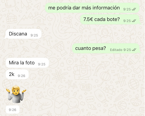 Al solicitar más información, me envió una foto borrosa sacada de la pantalla de un ordenador y no respondió de forma clara a mis preguntas. Le pregunté por el peso del producto, y su respuesta literal fue: “mira la foto”. En esa imagen pone “B2K”, lo cual me hace suponer que son 2 kilos, pero creo que no me corresponde a mí interpretar eso. Además, la foto muestra 4 colores, pero el nombre del artículo solo indica uno. No se aclara cuántos botes hay por lote ni otros detalles relevantes.