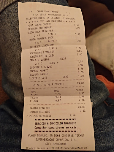 Read moreEstá muy bien cuando bajas al centro, lo único que no me gustó es que tenía tanta prisa por cobrarme la cajera... que se me olvidó darla la targeta de Carrefour, y en peñacastillo eso no me pasa, aunque a mi se me olvide, las cajeras siempre me lo recuerdan y así da gusto comprar. La tienda está genial, tiene de todo, pero el servicio deja mucho que desear, pregunté a 3 trabajadores donde estaban las quesadas y los tres me enviaron al sitio más lejos, resulta que estaban en el frigorífico que tenía al lado la cajera. Entre los paseos buscando 3 quesadas y lo de la los puntos, salí algo disgustada, la verdad, en peñacastillo si no lo encuentras a la primera de donde esta, la segunda te acompaña la persona y te enseña donde está y jamás se les olvida pedirte la tarjeta. Muchas gracias por darme la oportunidad de poder comentar mi opinión. Atentamente: Patricia...