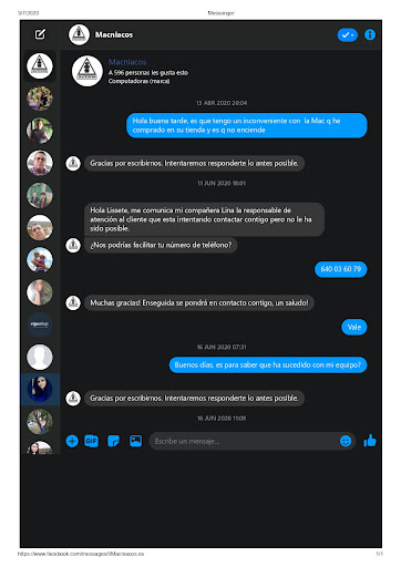 Read moreExpongo mi caso en Febrero de 2020 he comprado 😃💻 un ordenador en Macniacos, en Abril no volvió a encender 😐y lo lleve por garantía🙂 (al parecer no fueron capaces de arreglarlo y lo q venden no es de buena calidad) por lo cual 4 meses ⏳ después me salen con la super noticia q supuestamente el equipo estaba mojado 🤨 y q eso no lo cubre la garantía 😲 (a que suena a estafa😠, el costo es de 599€), el detalle acá es porqué ❓❓❓ en los meses anteriores dieron tantas largas 🤔, en las conversaciones me decían "ya casi está... Lo tiene el técnico en Valencia... En unos días llega..."⌛⏳⌛⏳🕰️, Y así varias conversaciones... Sería interesante saberlo, imagino que los posibles futuros clientes quisieran saber qué 🤷 pasaría si compran algo y llegase a fallar unos meses después de la compra, en mi caso y el de otra reseña q vi en fb de septiembre de 2019 no cumplen; me han sugerido que renuncie a mis derechos y que pierda el dinero, nada de seriedad definitivamente...