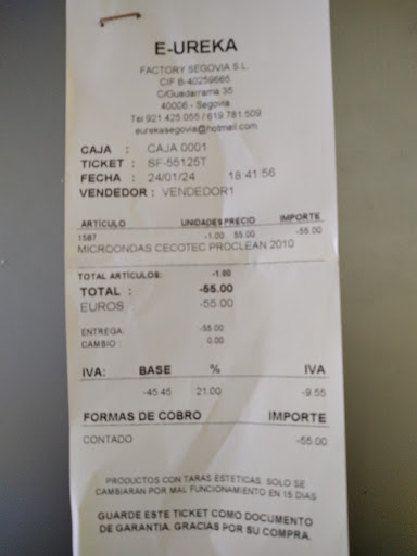 Read moreVale que tiene precios bajos por taras estéticas u otro defecto. Vale que lo que tienen en la tienda es lo que hay. Pero lo que no es de recibo es que tras comprar un electrodoméstico y volver dos días después a devolverlo sin ni siquiera hacerlo sacado de la caja precintada te digan que no devuelven el dinero, que te dan un vale. Un vale para gastar en una tienda que no es de compra frecuente!!!! Cierto es que tras razonar educadamente con el empleado me devolvieron el importe, pero el momento fue algo amargo. Como decía mi abuelo " el dinero del pobre va dos veces al mercado...."