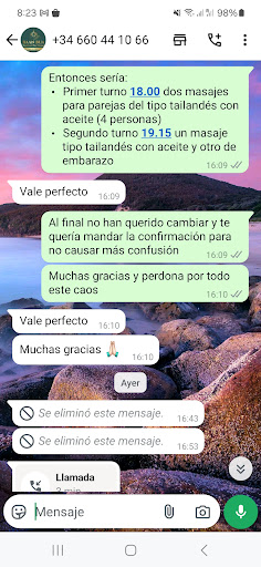 Al no contestar, me llaman y me dice primero que las salas están ocupadas. Le pregunto como es posible si desde el mes pasado tengo la reserva. Luego me intentan cambiar el orden de la reserva porque a ellos les viene bien sin importar los compromisos que podamos tener. No contentas con que les digo que no podemos hacer ese cambio empiezan a alegar que una de las personas encargada de dar los masajes está de descanso (otra diferente a la de las vacaciones). Que no pueden ser 4 en el primer turno. Ya en este momento cualquier excusa le es válida y empieza a decir cualquier cosa para que cambie los turnos, sin admitir su error. Ni darme una solución. Al final, la única solución fue anular la reserva sin pestañear. Ni si quiera me ofrecieron atendernos otro día.