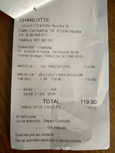 Read moreMe compré un traje de 140€ q tenía la cremallera descosida un pelín x debajo de probárselo las clientas, era algo tan mínimo que lo compré x tener costureras en la tienda y asegurarme q quedaría bien, lo compré un miércoles y sabían q iba con prisa xq la boda era para ese sábado no, el siguiente,pero me dicen q la costurera no me lo tendría hasta el miércoles siguiente, acepto y llamo el martes x si acaso y ya estaba en la tienda y no me avisaron sabiendo mis prisas, cuando lo recojo, el vestido estaba cosido a mano y con hilo de coser pantalones vaqueros, me dicen q lo dejé allí q mañana me lo arregla otra costurera y acepto, cuando lo vuelvo a recoger el trabe estaba igual de mal cosido y se abría la costura, q pasa.. q sabían q no tenía tiempo ya era viernes y me dicen q me lo ponga y q luego lo traiga y me lo cosen bien, ¡¡¡para q lo quiero bien luego!!!!! Increíble! Ya veo en los comentarios q no soy a la única...